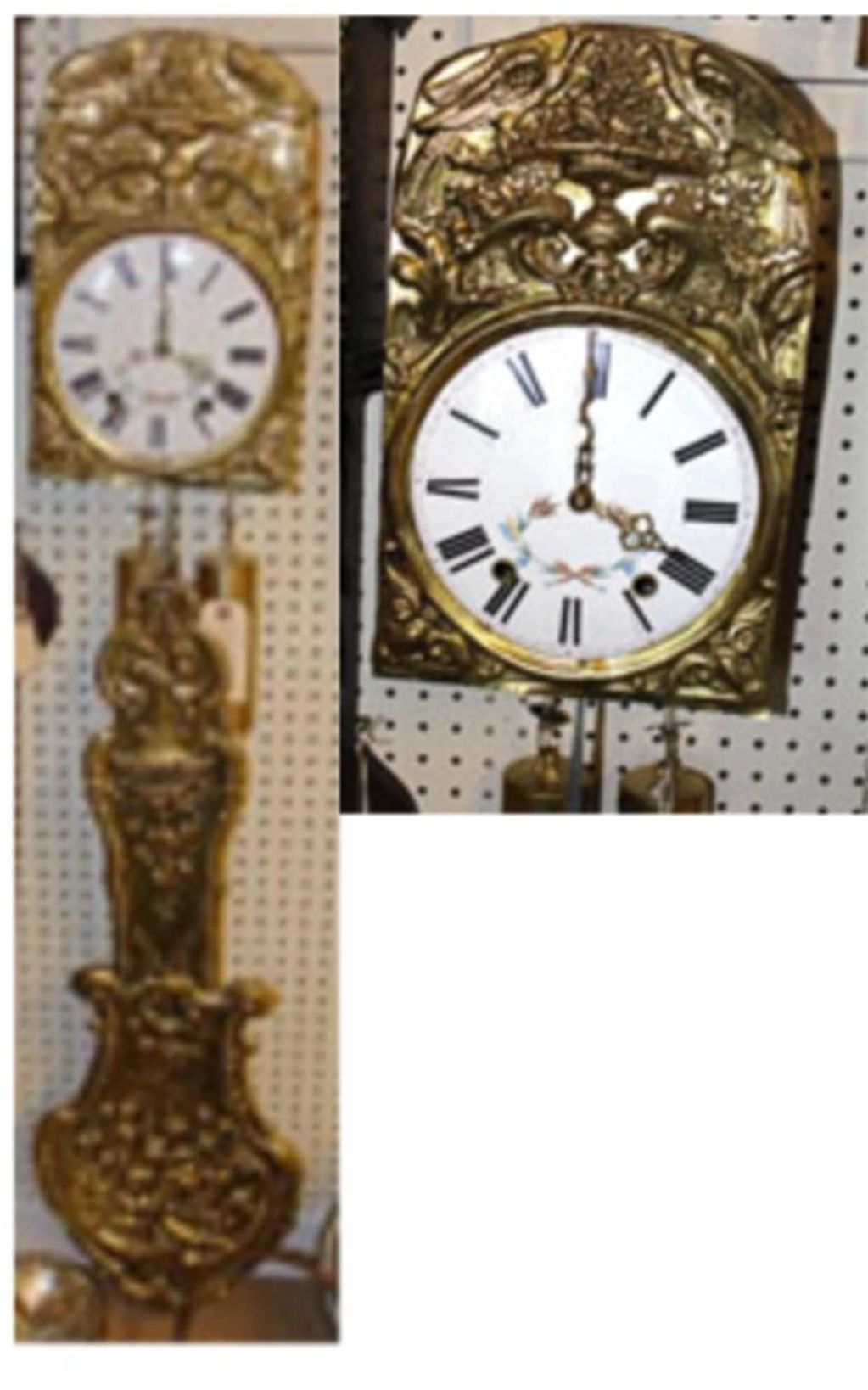 Antique French mobier comtoise clock with starburst,19th century Foil embossed brass at decor of winged dragons and a basket of flowers. Runs well, Keeps Striking. You fix.Enameled dial.