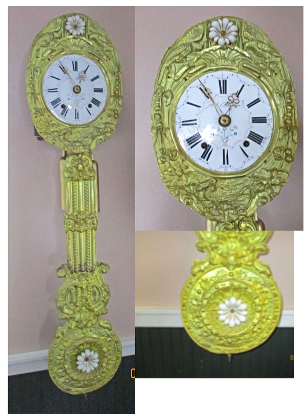Rare Antique original French wag on wall morbid, Embossed brass with porcelain flowers on face and pendulum. Porcelain face. Approx circa 1870.