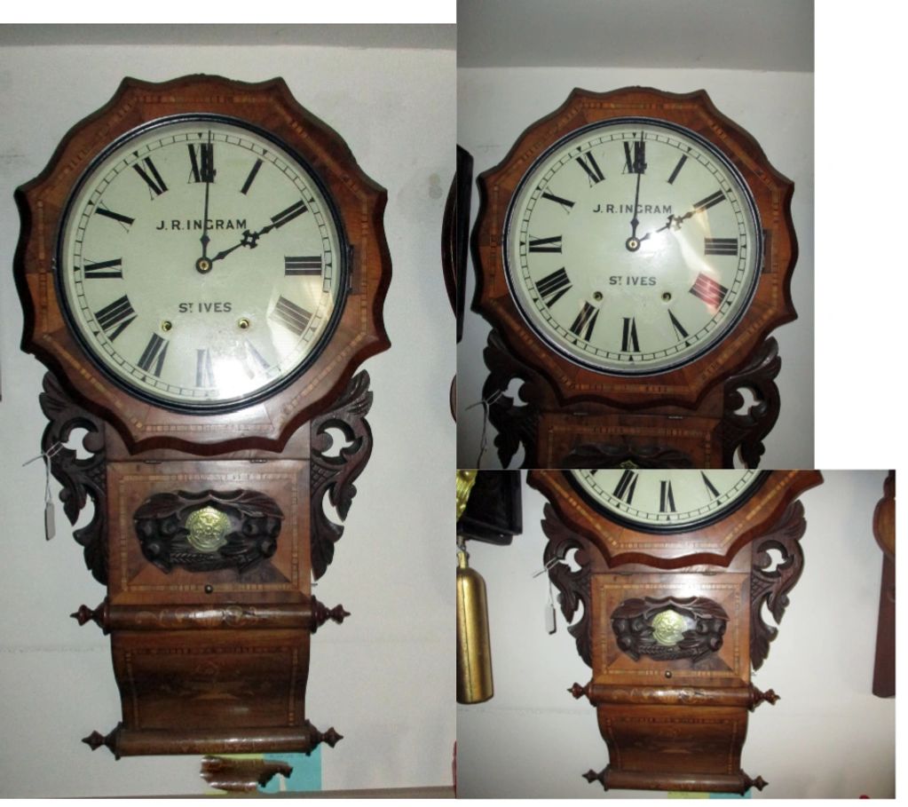 Antique Victorian Drop dial wall clock, dial reads J.R. Ingram St. Ives. Very decorative inlaid walnut case with carved mahogany accent pieces and brass pendulum. 8 Day movement chimes half and full hour.