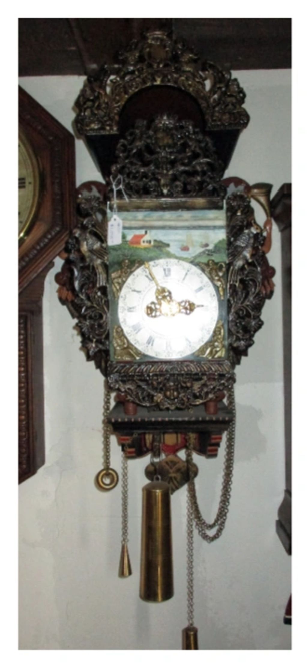 Dutch Friesian wall / tail clock from the Netherlands with moon phase warming vintage tuba, with atlas and angels.