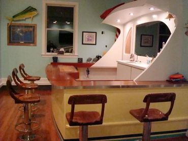 We repurposed a boat and custom made the back cabin wall and door with porthole. Can customize a boat bar for you any length, style, color, etc etc. Call 603-455-5660