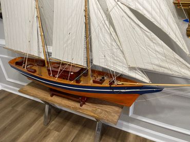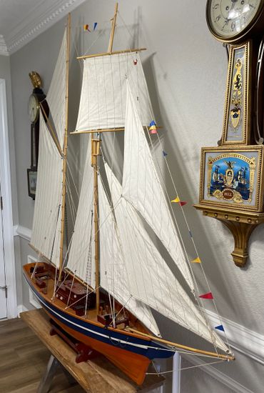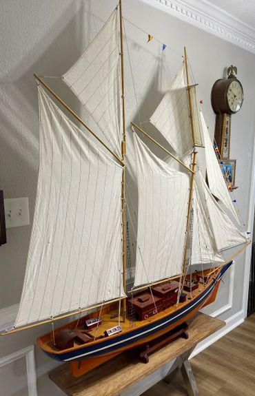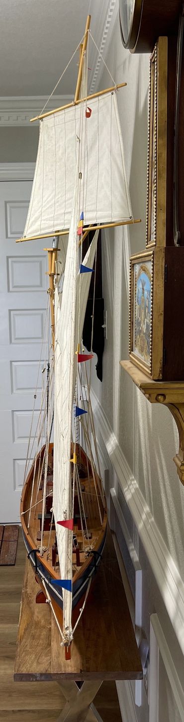 Large sail boat model with cradle. Measures 77'' long, 69'' tall , masts come out for transportation.Nicely built.